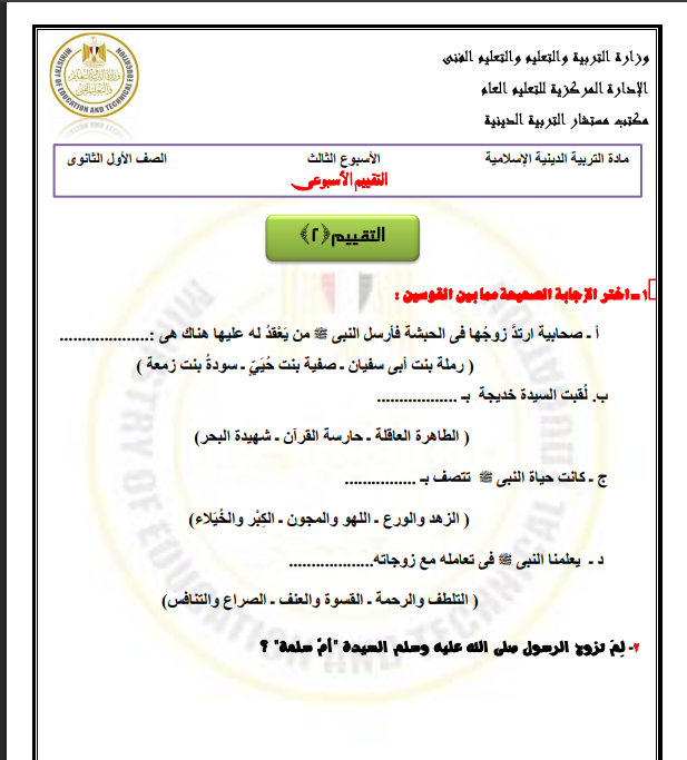 - التقييم الاسبوعي للصف الأول الثانوي التربية الاسلامية