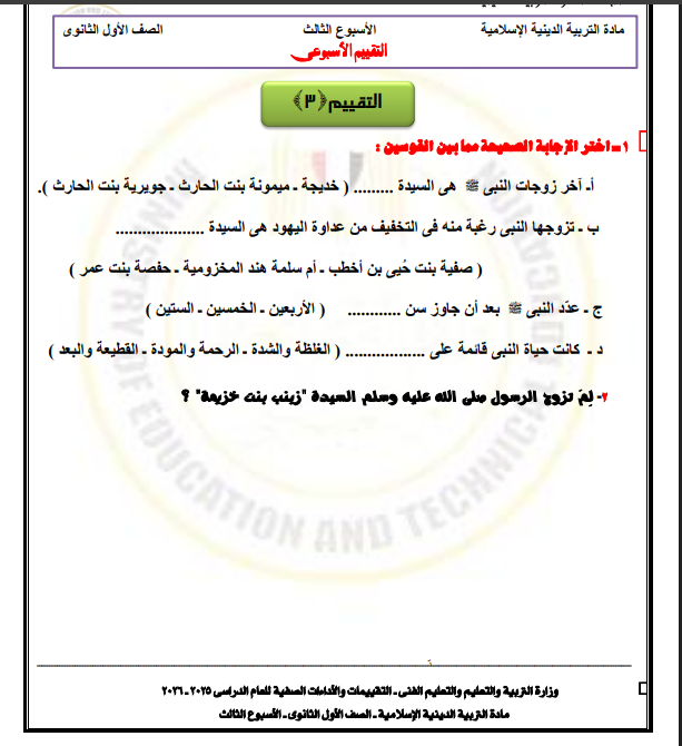 - التربية الاسلامية تقييم الأسبوع الثالث