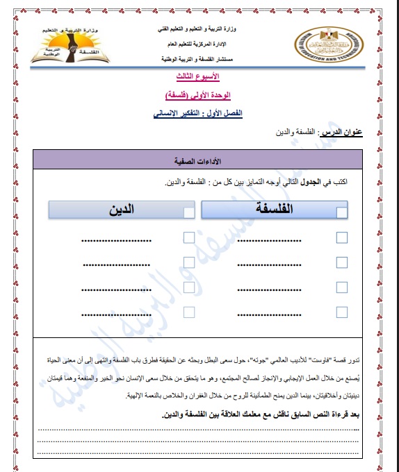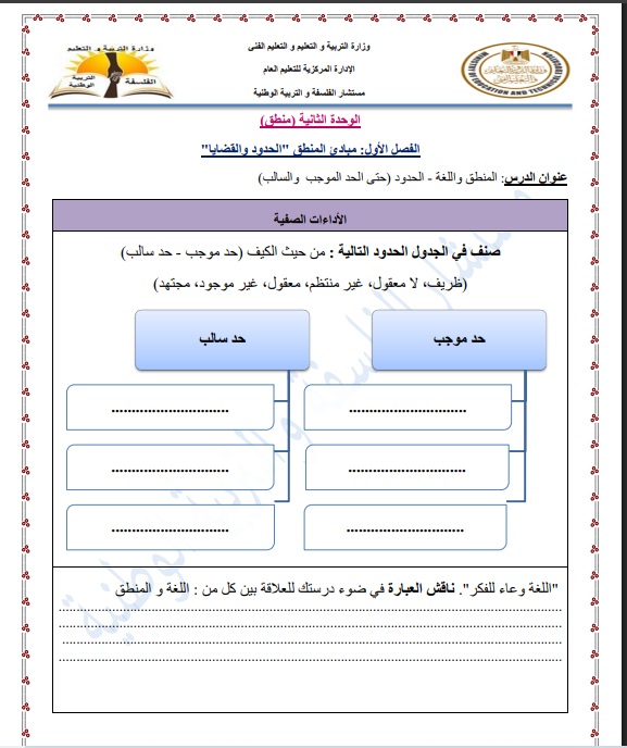 رابط الآداء الصفي الأسبوع الثالث الفلسفة والمنطق ترم ثاني الصف الأول الثانوي