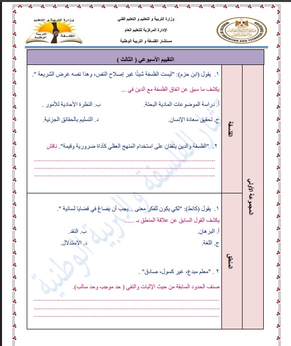 - التقييم الاسبوعي للصف الأول الثانوي الفلسفة والمنطق