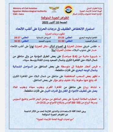 حالة الطقس اليوم الخميس في مصر.. أعلنت الهيئة العامة للأرصاد الجوية تفاصيل حالة الطقس المتوقعة اليوم الجمعة 10 أكتوبر 2025، حيث يستمر الانخفاض الطفيف في درجات الحرارة على أغلب أنحاء الجمهورية، وتشير التوقعات إلى طقس خريفي معتدل خلال ساعات الصباح الباكر، يميل للحرارة خلال ساعات النهار في معظم المناطق، ويكون حارًا على مناطق جنوب الصعيد، فيما يسود طقس معتدل ليلًا.