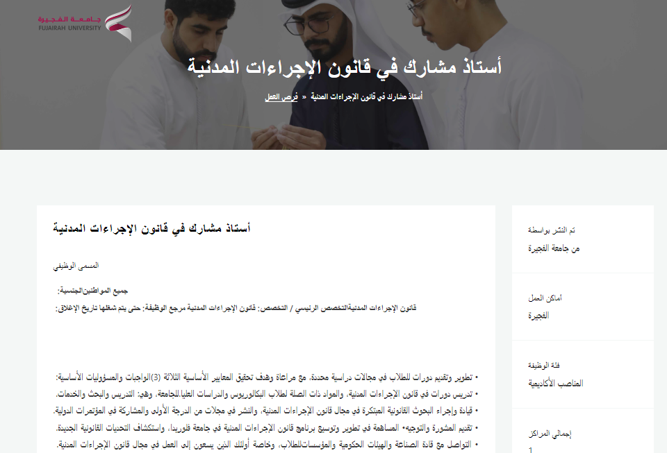 وظيفة جامعة .. في إطار سعيها المتواصل نحو ترسيخ مكانتها كإحدى الجامعات الرائدة في التعليم القانوني بالمنطقة، أعلنت جامعة الفجيرة عن توافر وظيفة أستاذ مشارك في قانون الإجراءات المدنية ضمن كلية القانون، وهي خطوة جديدة تؤكد التزام الجامعة بتطوير بيئة أكاديمية متكاملة تجمع بين التعليم المتميز والبحث العلمي التطبيقي الذي يواكب المتغيرات التشريعية الحديثة على المستويين المحلي والدولي.
