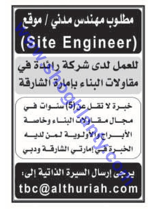 تعلن شركة رائدة في مجال المقاولات والبناء يإمارة الشارقة بدولة الامارات العربية المتحدة عن حاجتها للتعاقد مع مهندسين في جميع التخصصات وفقا لشروط التالية: