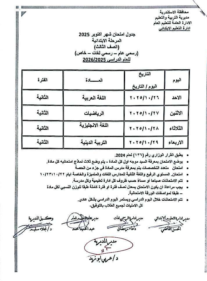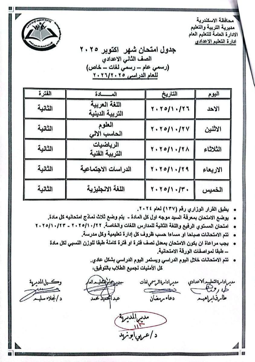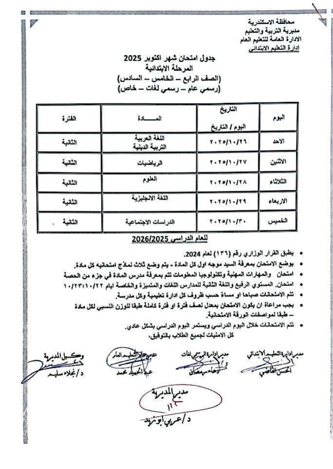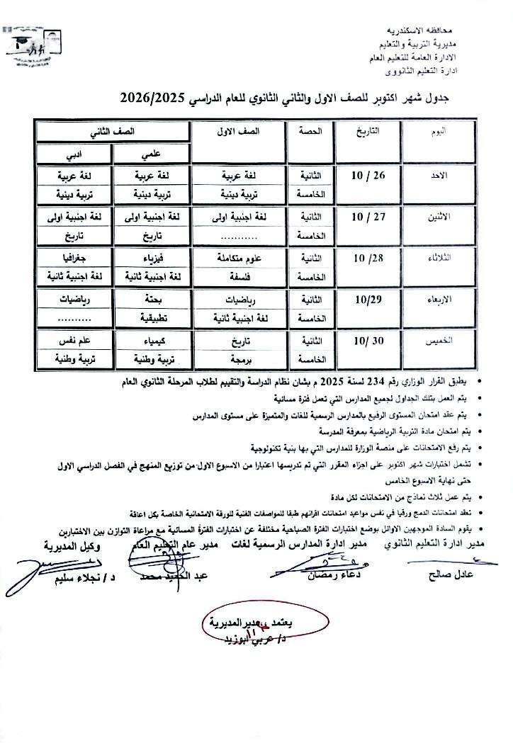 جداول امتحانات شهر أكتوبر 2025 في محافظة الإسكندرية.. المواعيد الرسمية