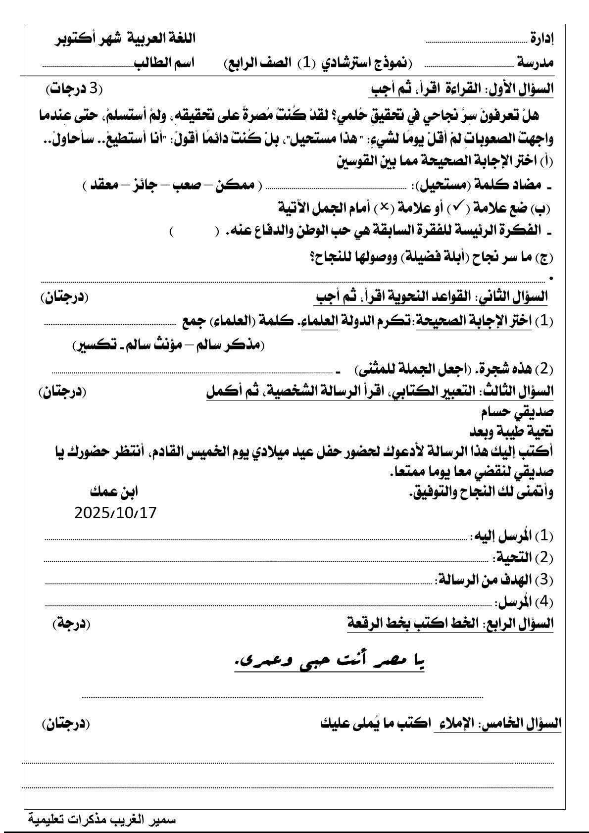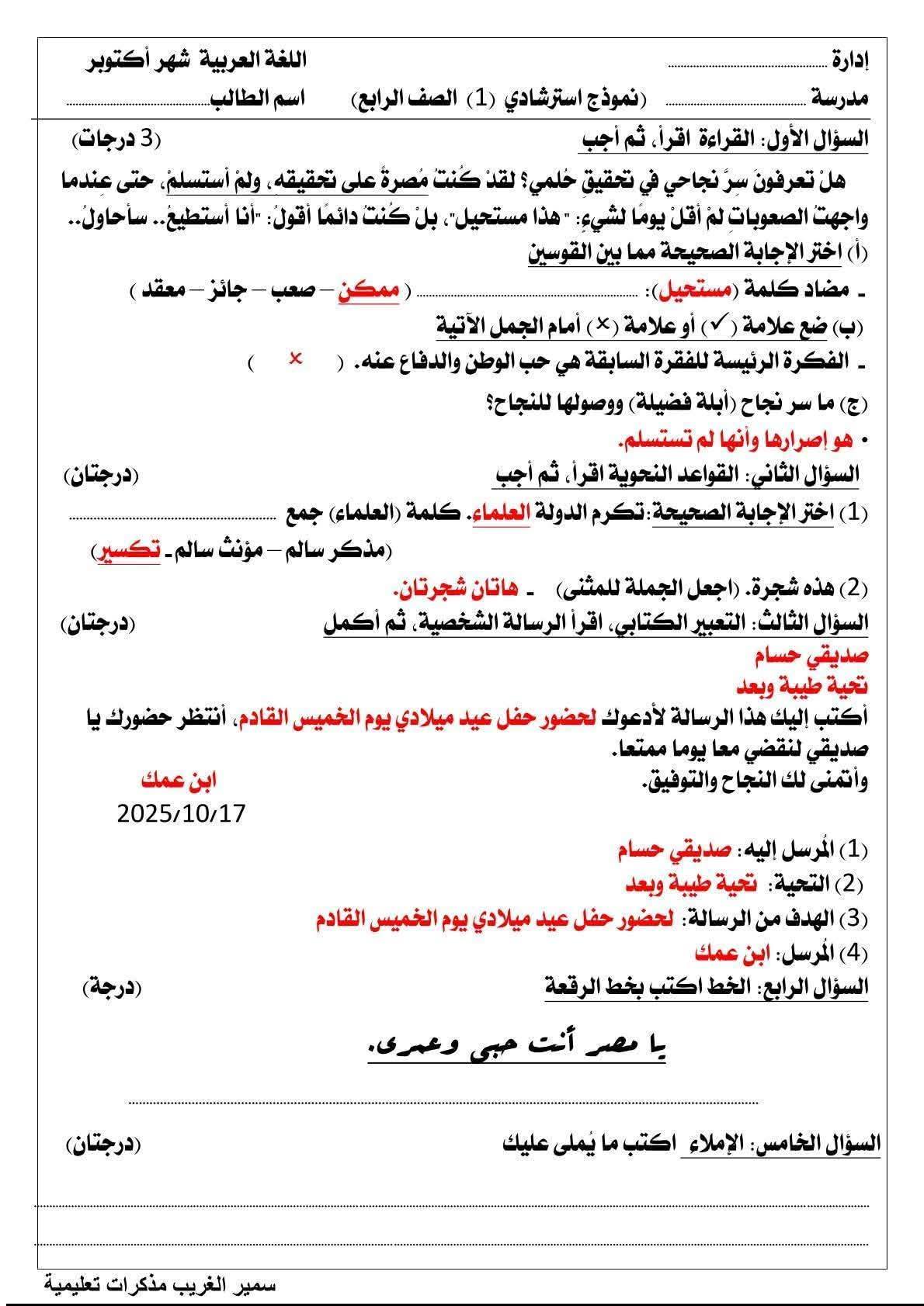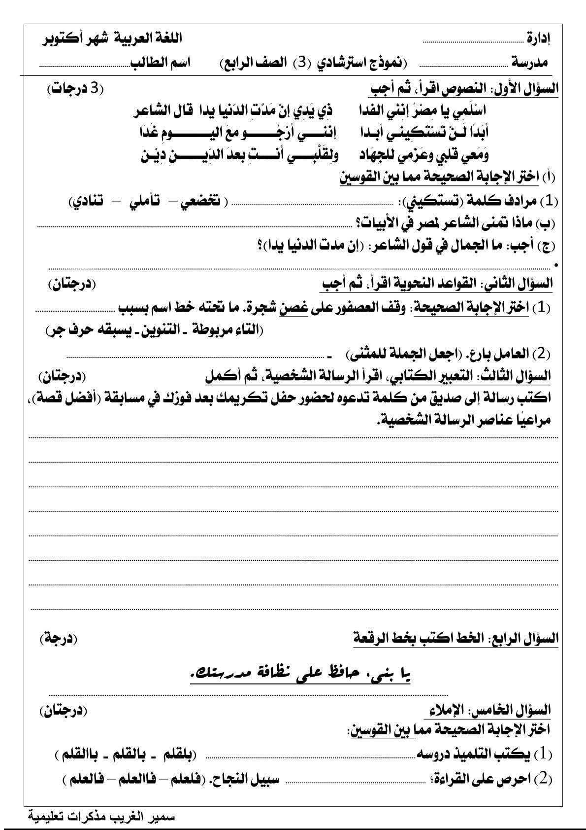 - مراجعات نهائيه امتحان اللغة العربية رابعة ابتدائي
