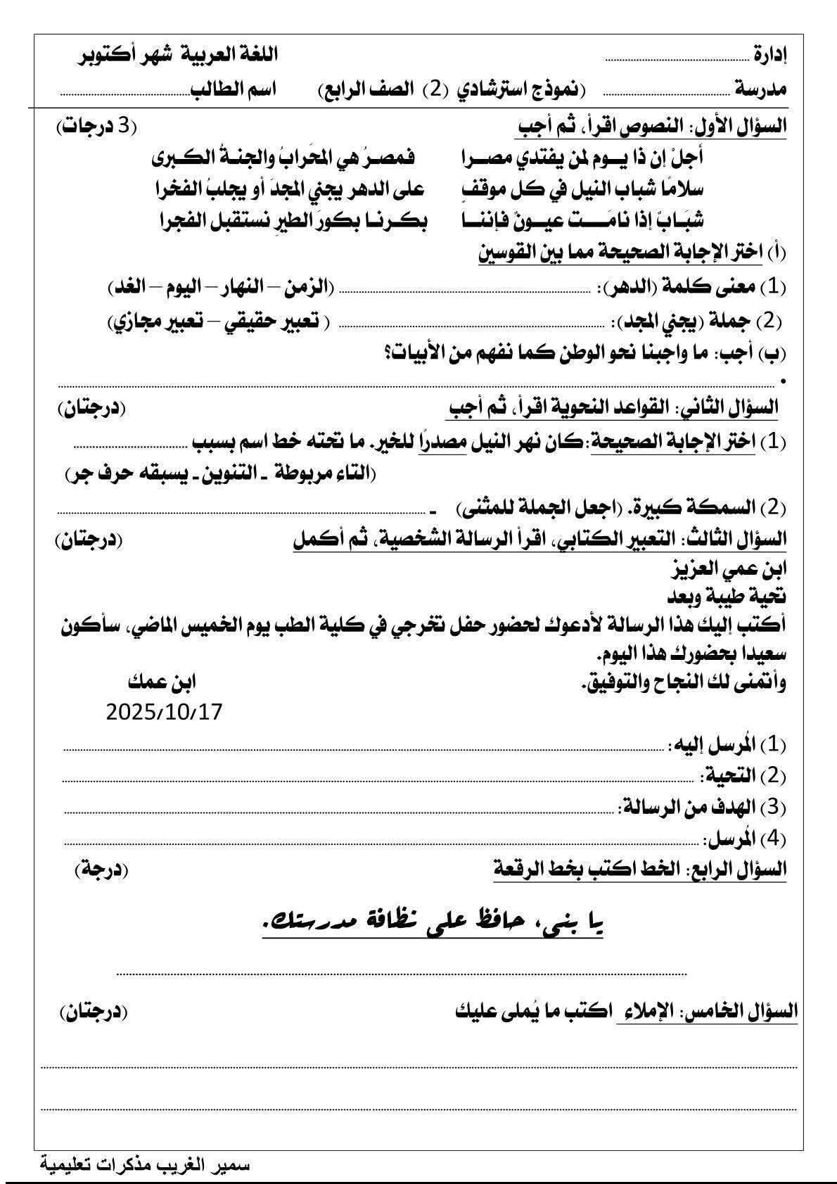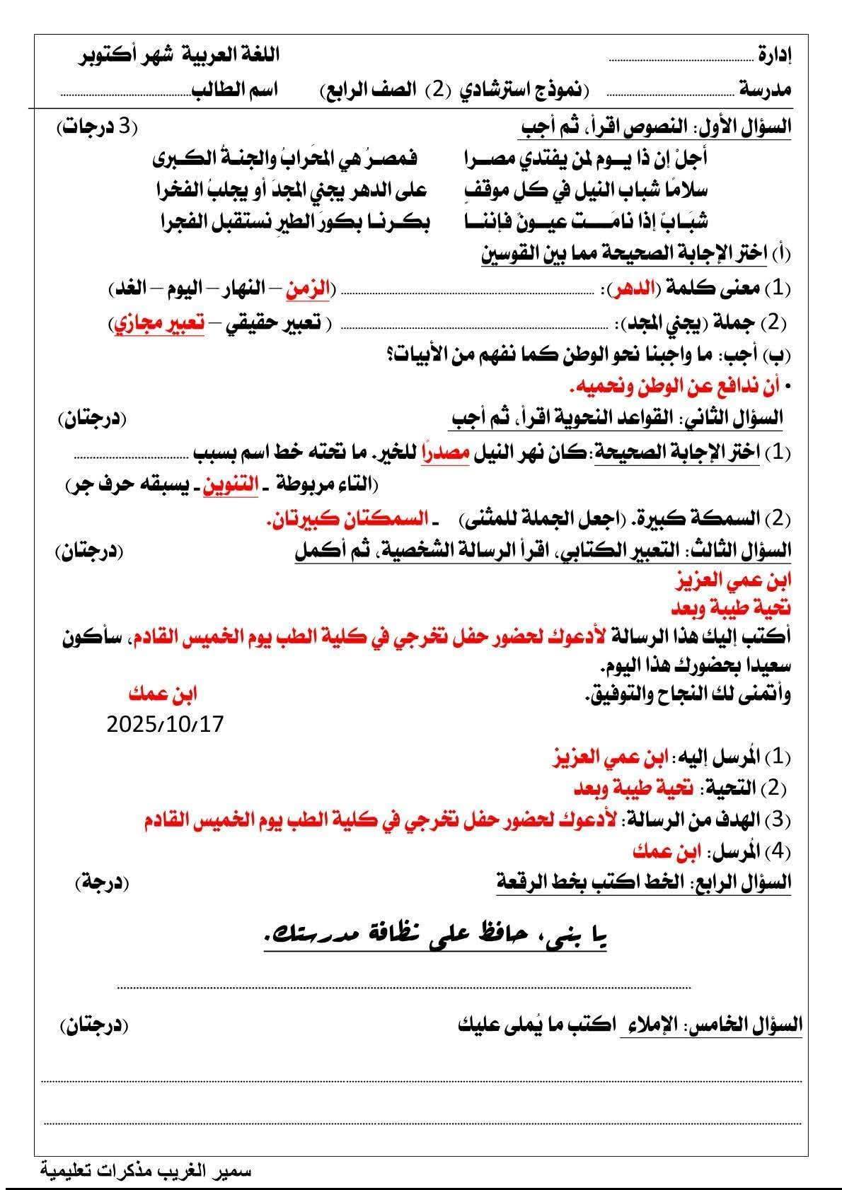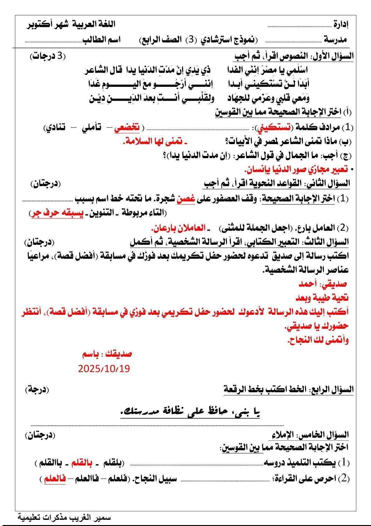 حل 3 نماذج استرشادية في العربي.. وتحميل أقوى مراجعة ليلة امتحان اللغة العربية، تضمن لك دخول الامتحان وهو في جيبك، لطلاب وطالبات الصف الرابع الابتدائي، من خلال امتحانات اللغة العربية، تضمن لك مراجعات نهائية في منهج الفصل الدراسي الأول، والتى تعد مرجعا أساسيا في مراجعات نهائيه، لمقرر المنهج الدراسي للعام الدراسي الجاري 2025-2026، أعدها خبراء المادة في وزارة التربية والتعليم، من أجل مراجعات نهائيه لطلاب الصف الرابع الابتدائي.