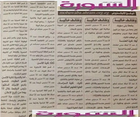 أعلنت جامعة بني سويف عن وظائف شاغرة لتعيين اعضاء هئية تدريس جدد بعدد من الكليات في مختلف التخصصات