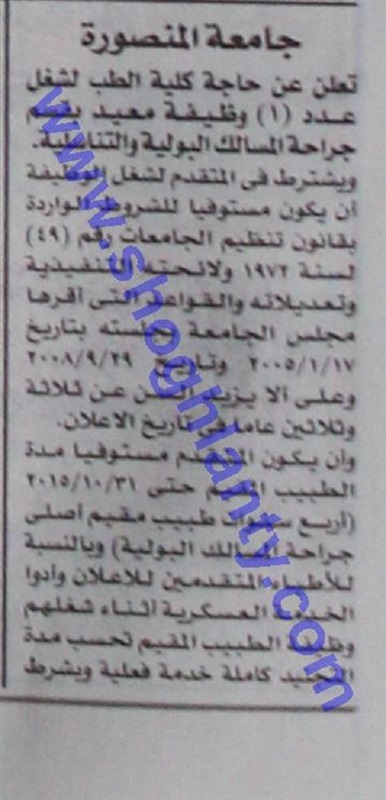 أعلنت المنصورة عن وظائف شاغرة لتعيين اعضاء هئية تدريس جدد وذلك في الكليات والتخصصات التالية: