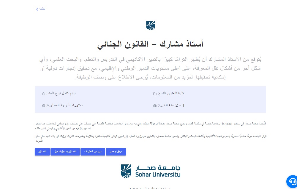 وظيفة جامعة .. تعلن جامعة صحار عن توفر وظيفة أكاديمية متميزة في القانون الجنائي، حيث تسعى لتعيين أستاذ مشارك ضمن كلية الحقوق تقع جامعة صحار في سلطنة عمان وتعتبر من أبرز الجامعات الخاصة في البلاد، مما يتيح للمتقدمين فرصة العمل في بيئة أكاديمية ديناميكية ومتميزة.