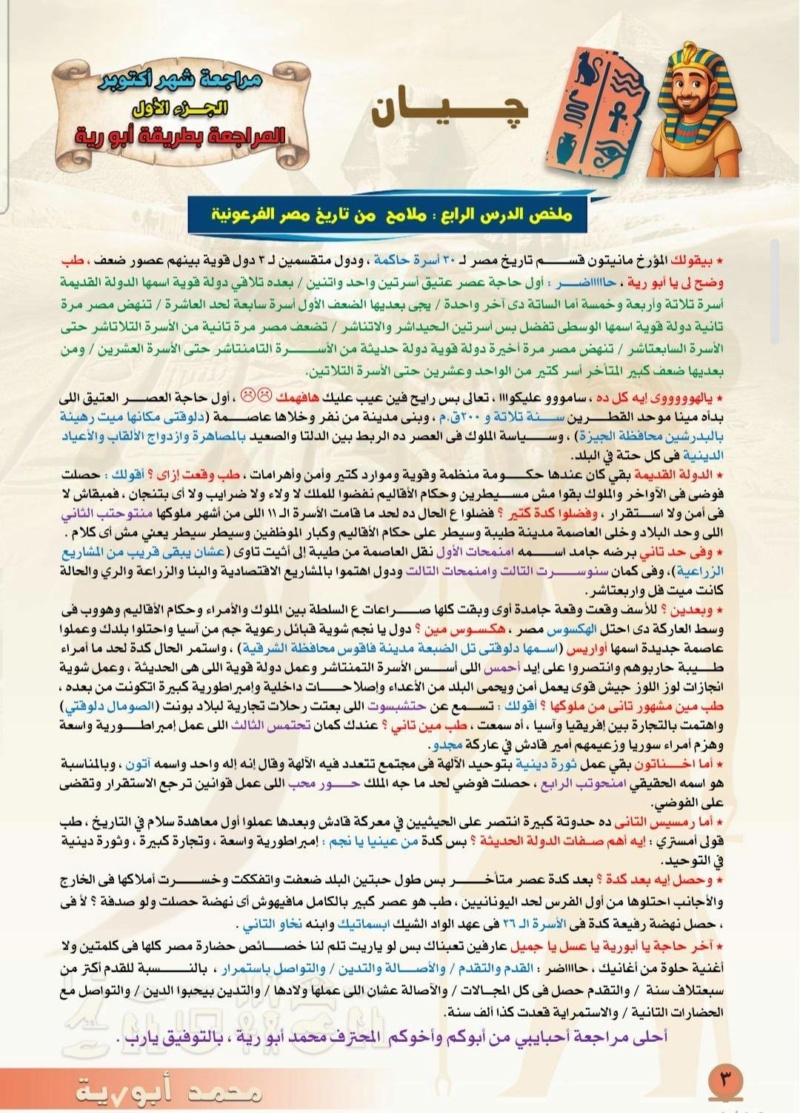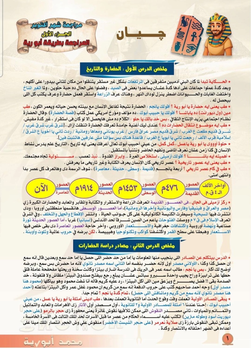 مراجعة نهائية التاريخ لشهر أكتوبر في 3 ورقات لـ الصف الأول الثانوي