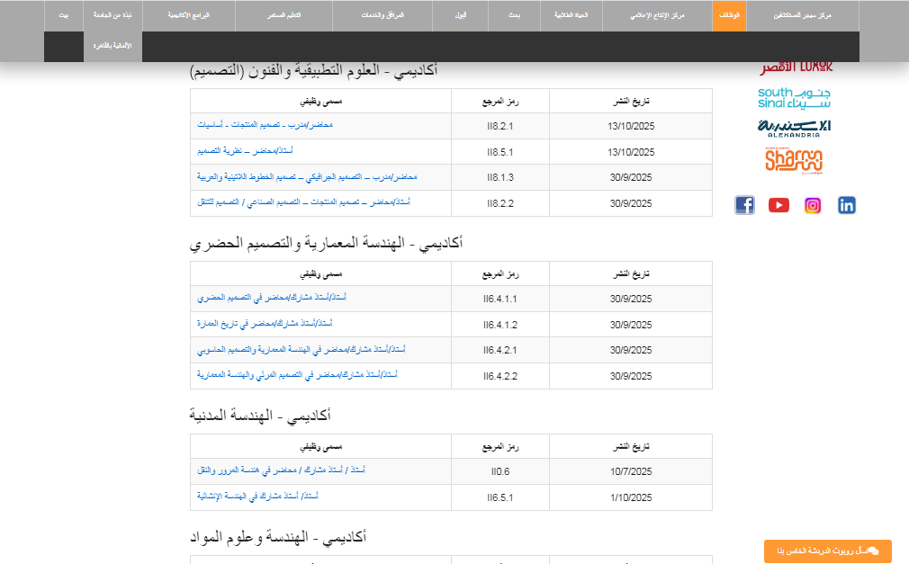 تضم قائمة الوظائف الأكاديمية الشاغرة عددًا من التخصصات البارزة في كلية العلوم التطبيقية والفنون، من بينها وظائف محاضر ومدرب في تصميم المنتجات – أساسيات التصميم، ووظائف أستاذ أو محاضر في نظرية التصميم، بالإضافة إلى محاضرين ومدربين في التصميم الجرافيكي وتصميم الخطوط اللاتينية والعربية، إلى جانب وظائف أستاذ أو محاضر في تصميم المنتجات الصناعية والتصميم للتنقل. وتهدف هذه التخصصات إلى دعم الأقسام المعنية بالفنون الإبداعية والتطبيقية وتطوير برامجها بما يواكب أحدث الاتجاهات العالمية في مجال التصميم والتكنولوجيا.