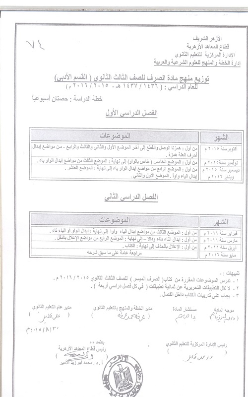 بالصور| خطة توزيع منهج مادة "الصرف" للصف الثالث الثانوى الأزهرى "أدبى"