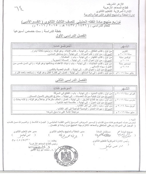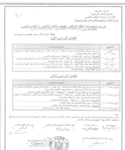 بالصور| خطة توزيع منهج مادة "الفقه" لمذهبى المالكى والحنبلى للصف الثالث الثانوى الأزهرى "أدبى"