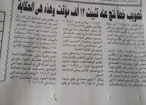 أكد الدكتور اشرف العربى، وزير التخطيط، ان هناك تصويب نتج عنه تثبيت 12 الف مؤقت، وان المادة 70 كانت تنص على تعيين فى ادنى الدرجات على بند الاجور الثابتة الباب الاول كل من امضى ستة شهور من تاريخ نقله على الباب الاول بشرط تعاقده قبل 2012/5/1.
