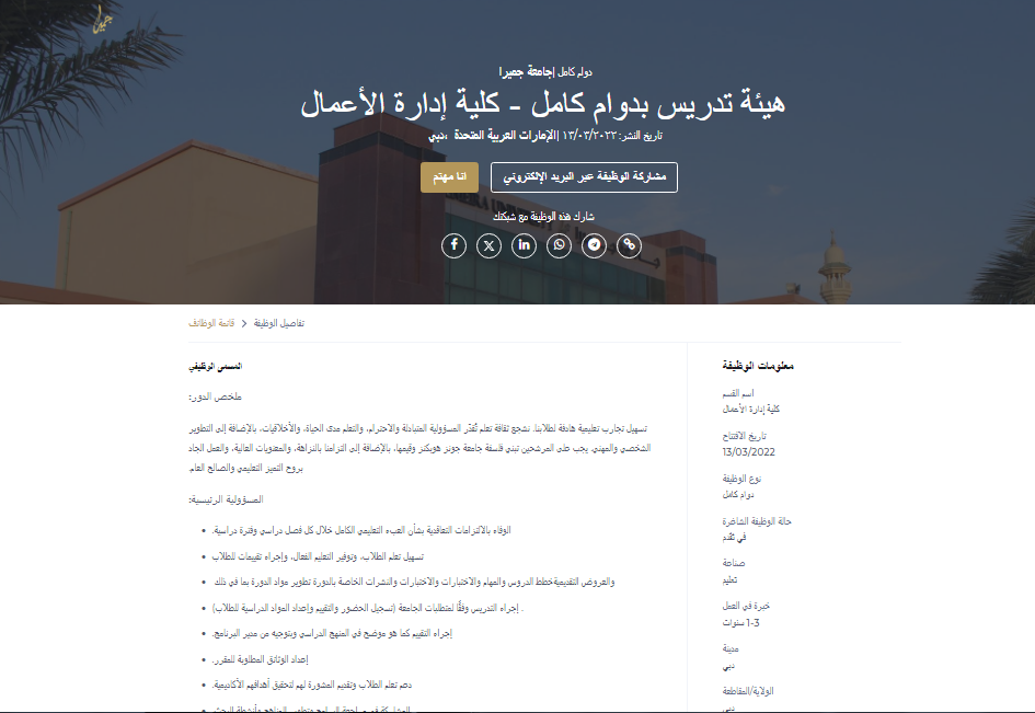 وظيفة جامعة.. جامعة جميرا تعلن عن وظائف أكاديمية لأعضاء هيئة التدريس في عدد من الكليات