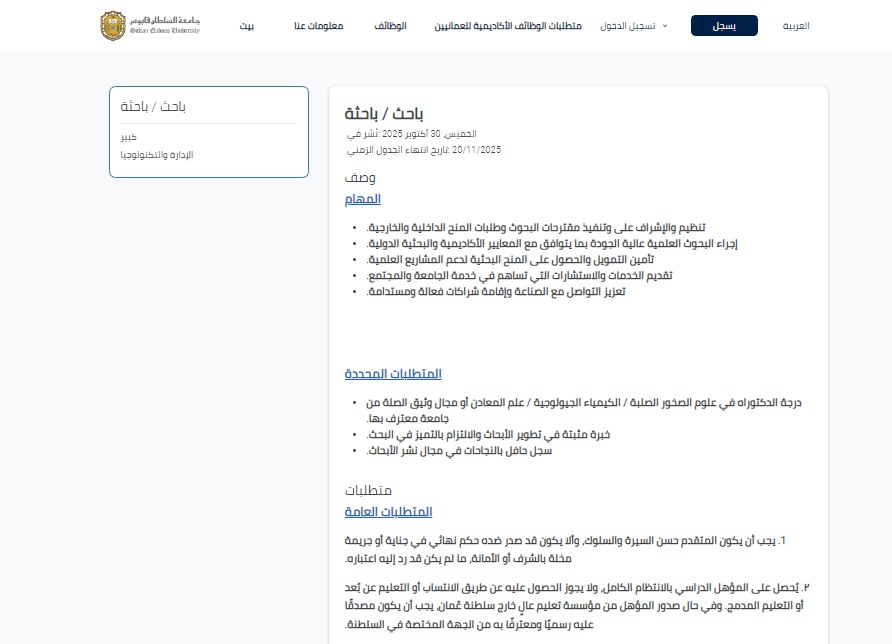 وظيفة جامعة.. أعلنت جامعة السلطان قابوس عن فتح باب التقديم لوظيفة باحث أو باحثة في تخصصات علوم الصخور الصلبة، والكيمياء الجيولوجية، وعلم المعادن، وذلك حتى 20 نوفمبر 2025.