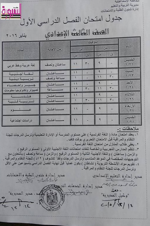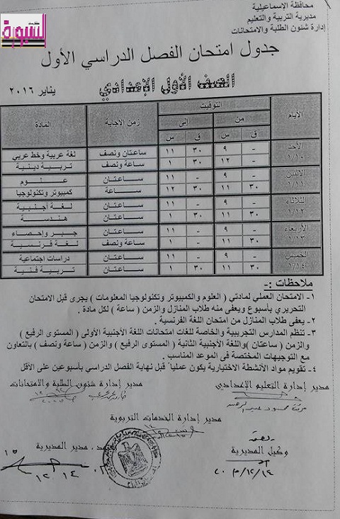 أعلنت مديرية التربية والتعليم بمحافظة الإسماعيلية عن انطلاق امتحانات الفصل الدراسي الاول للعام الدراسي 2015 \2016 يوم السبت الموافق 2 يناير للصفين الثاني و الثالث الابتدائي وتبدأ امتحانات الصفين الرابع و الخامس الابتدائي يوم الثلاثاء الموافق 4 يناير .