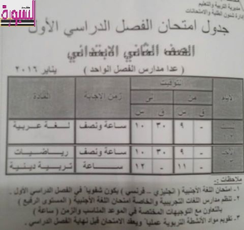 واوضحت المديرية ان امتحانات الصف السادس الابتدائي تبدأ يوم السبت الموافق 16 يناير و امتحانات الصف الثالث الاعدادي تبدا يوم الخميس الموافق 21 يناير .