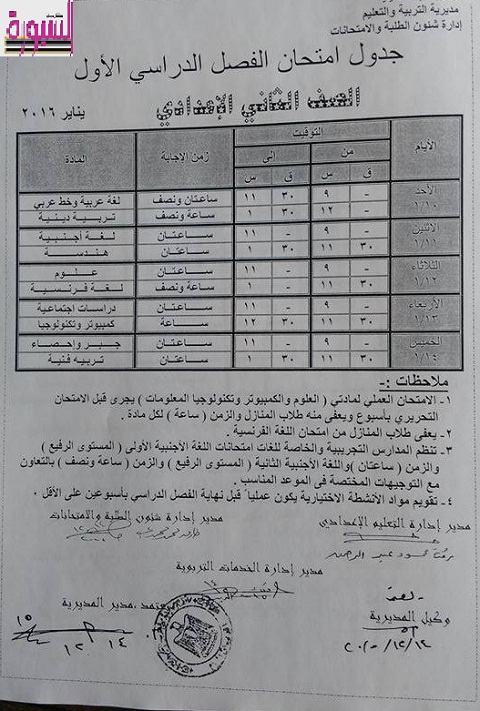 على ان تبدأ امتحانات الصفين الاول و الثاني الاعدادي يوم الاحد الموافق 10 يناير و الصفين الاول و الثاني الثانوي العام يوم الاثنين الموافق 12 يناير .