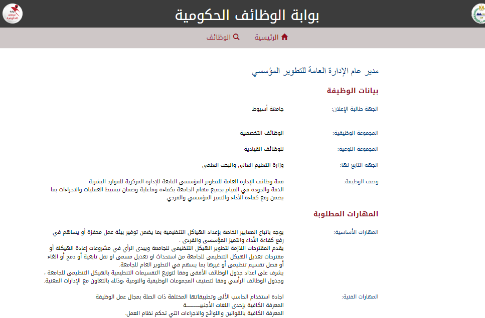 وظيفة جامعة .. أعلنت جامعة أسيوط عن فتح باب التقديم لشغل وظيفة مدير عام الإدارة العامة للتطوير المؤسسي، وهي إحدى الوظائف القيادية التابعة للإدارة المركزية للموارد البشرية بوزارة التعليم العالي والبحث العلمي.