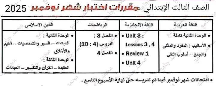- ثالثة ابتدائي مقررات اختبار شهر نوفمبر