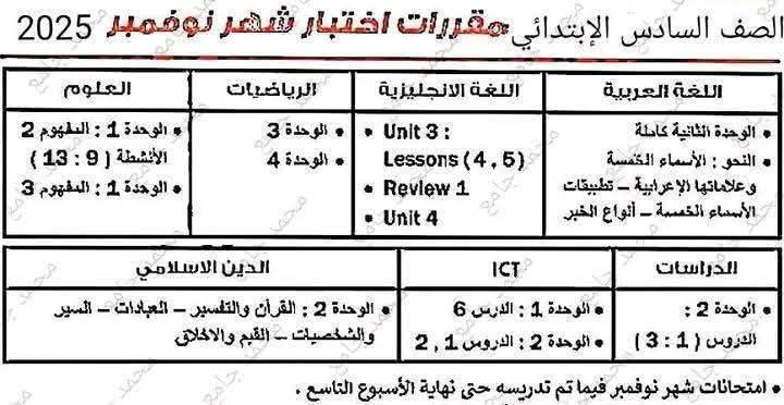 الصف السادس الإبتدائي مقررات اختبار شهر نوفمبر 2025