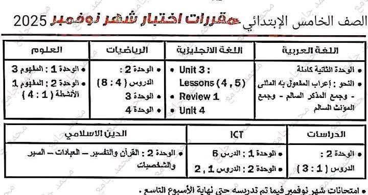 الصف الخامس الإبتدائي مقررات اختبار شهر نوفمبر 2025