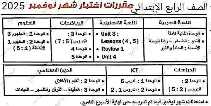 الصف الرابع الإبتدائى مقررات اختبار شهر نوفمبر 2025