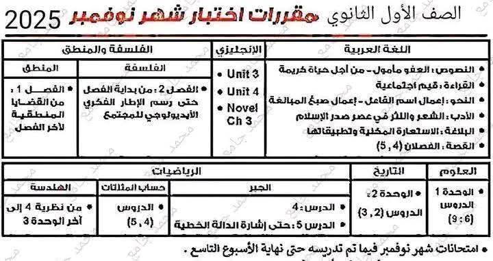 - مقررات اختبار شهر نوفمبر أولى ثانوي