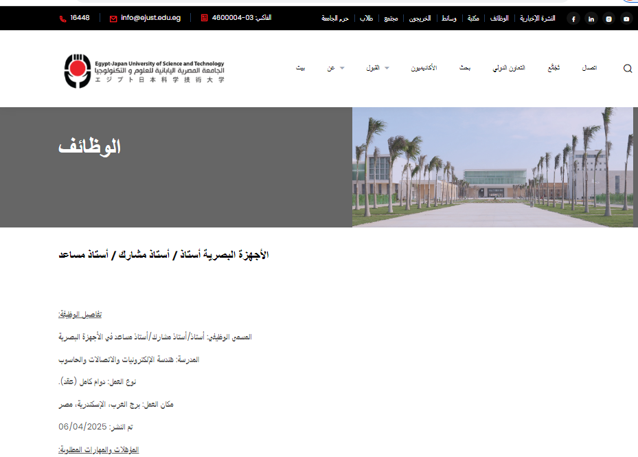 وظيفة جامعة.. تعلن الجامعة المصرية اليابانية للعلوم والتكنولوجيا عن فتح باب التقديم لشغل وظيفة أستاذ أو أستاذ مشارك أو أستاذ مساعد في مجال الأجهزة البصرية، ضمن مدرسة هندسة الإلكترونيات والاتصالات والحاسوب، وذلك للعمل بدوام كامل في مقر الجامعة بمدينة برج العرب بالإسكندرية.