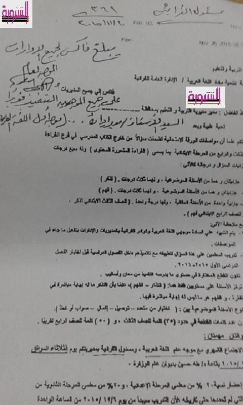 حصلت "السبورة" على الفاكس المرسل لجميع المدارس والذي ينبه الخاص بمعلمى الصفين الثالث والرابع الابتدائي والذي ينص على الآتى: