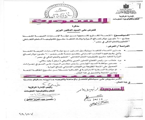 والاخر ، من وزارة التعاون الدولى موجه الي اللواء حسام ابوالمجد رئيس قطاع مكتب الوزير بتاريخ 7/5/2015 ينص على " بالاشارة الى صدور موافقة السيد المهندس رئيس مجلس الوزراء على السير فى اجراءات الحصول على المنحة المقترح تقديمها من الجانب الاماراتى بمبلغ 600 مليون دولار لصالح وزارتكم الموقرة بهدف تنفيذ مشروع تكنولوجيا التعليم التفاعلى "التعليم والتعلم الذكى فى مصر بتاريخ26/3/2015