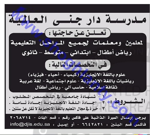 تعلن مدرسة دار جني العالمية السعودية عن حاجتها للتعاقد مع معلمين ومعلمات في جميع المواد والمراحل التعليمية وفقا للشروط التالية :-