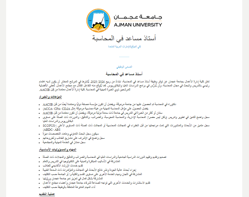وتؤكد جامعة عجمان أن هذه الوظيفة تمثل فرصة متميزة للأكاديميين المتخصصين في المحاسبة الراغبين في العمل داخل بيئة تعليمية متطورة ومبتكرة، مع فرصة المشاركة في تطوير برامج تعليمية وبحثية تسهم في تعزيز مكانة الجامعة على المستويين المحلي والدولي.