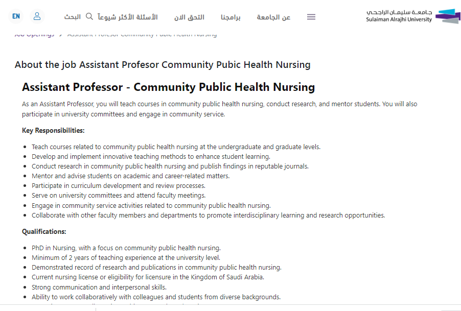 تعد وظيفة أستاذ مساعد في تمريض الصحة العامة المجتمعية في جامعة سليمان الراجحي فرصة متميزة للمتخصصين في هذا المجال الراغبين في تقديم مساهمة علمية وتعليمية قيمة.