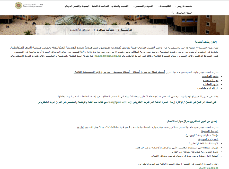وطلبت الكلية من الراغبين إرسال السيرة الذاتية عبر البريد الإلكتروني المخصص، مع ضرورة كتابة اسم الكلية والوظيفة والتخصص في عنوان الرسالة.