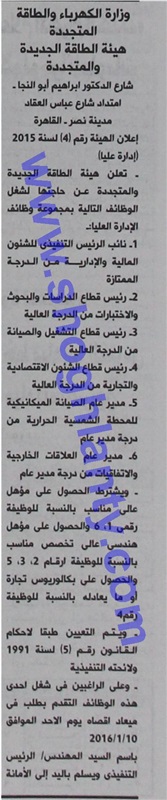 تعلن هيئة الطاقة الجديدة والمتجددة التابعة لوزارة الكهرباء عن حاجتها لشغل عدد من الوظائف من خريجى الهندسة والتجارة، وعلى الراغبين فى التقدم موعد اقصاه يوم الاحد الموافق 10 يناير، وتسلم الطلبات باسم المهندس/ الرئيس التنفيذى ويسلم باليد الى الامانة الفنية للجنة الدائمة للوظائف القيادية بالهيئة على العنوان التالى شارع الدكتور ابراهيم ابو النجا / امتداد شارع عباس العقاد / مدينة نصر / القاهرة.