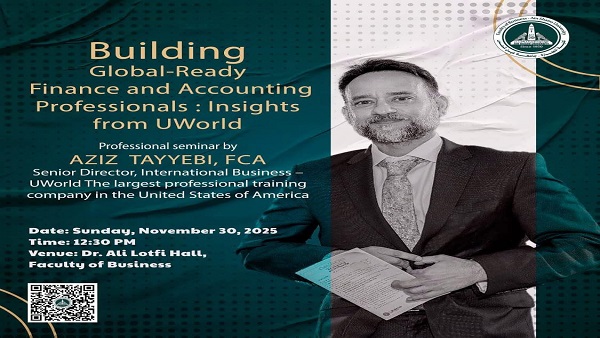 تستضيف جامعة عين شمس الدكتور Aziz Tayyebi، FCA، المدير الأول للشؤون الدولية في UWorld، وأحد كبار المتخصصين في التدريب المهني الدولي، ليقدم رؤى عملية حول كيفية إعداد الطلاب ليصبحوا محترفين في المالية والمحاسبة قادرين على المنافسة عالميًا.