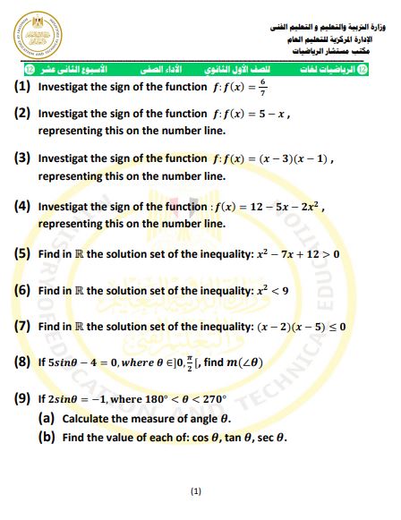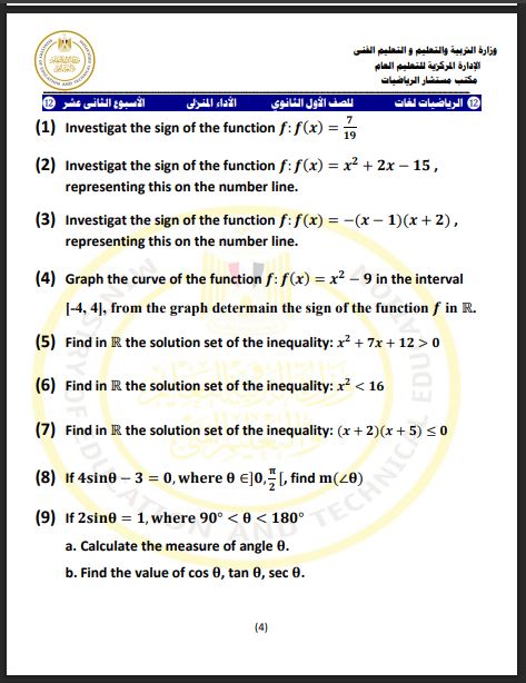 مراجعات نهائية.. أسئلة تقييم الأسبوع الـ 12 الرياضيات الصف الأول الثانوي