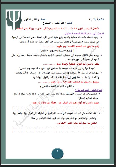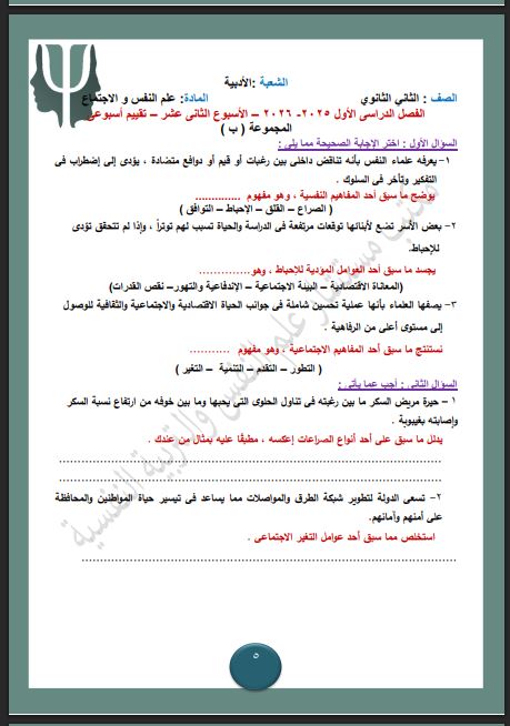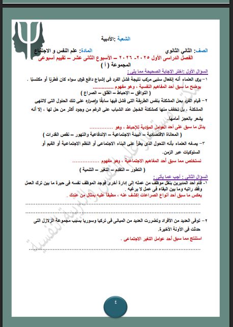 لطلاب الصف الثاني الثانوي.. أسئلة تقييمات الأسبوع الـ 12 علم النفس والاجتماع