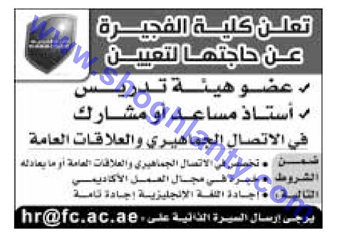 تعلن جامعة الفجيرة الامارتية عن حاجتها للتعاقد مع أعضاء هيئة التدريس وذلك في التخصصات التالية: