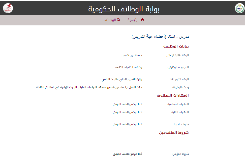 ويوضح معهد الدراسات العليا والبحوث الزراعية أن شروط شغل الوظيفة تتضمن توافر المؤهلات العلمية والخبرات العملية كما هو موضح في الملفات التفصيلية المرفقة مع الإعلان.