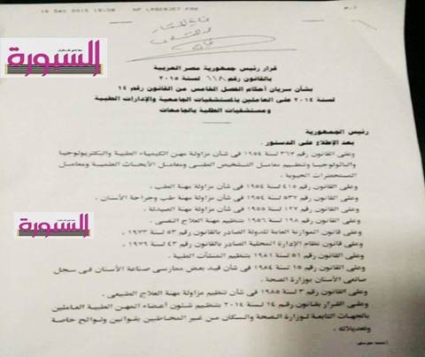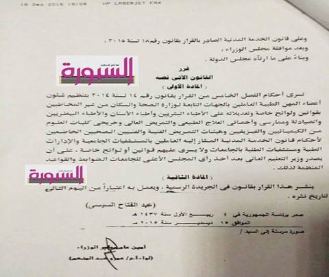 أصدر الرئيس عبد الفتاح السيسي القراربقانون رقم 118 لسنة 2015 بتطبيق الفصل الخامس من قانون تنظيم شؤون أعضاء المهن الطبية العاملين بالجهات التابعة لوزارة الصحة على العاملين بالمستشفيات الجامعية والإدارات الطبية ومستشفيات الطلبة بالجامعات.