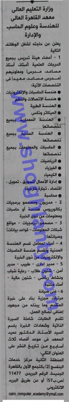 يعلن معهد القاهرة العالي للهندسة وعلوم الحاسب والإدارة عن حاجته للتاقد مع أعضاء هيئة التدريس وذلك في التخصصات التالية: