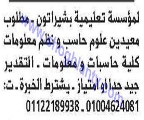 تعلن مؤسسة تعليمية بشيراتون عن حاجته للتعاقد مع معيدين علوم الحاسب ونظم معلومات كلية حاسبات ومعلومات.