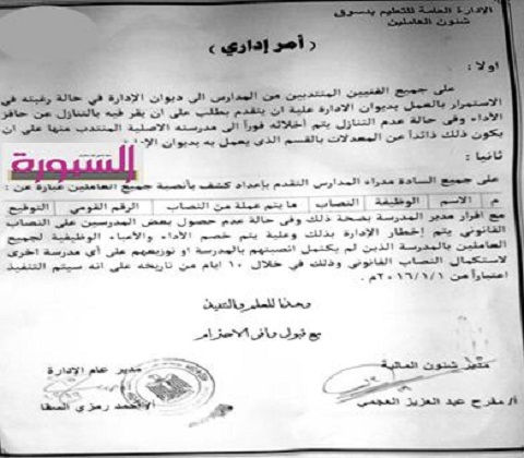 أصدر أحمد السقا مدير ادارة دسوق التعليمية امرا اداريا لمديري المدارس باعداد كشوف بانصبة العاملين بالمدارس وتقديم مدير المدرسة اقرارا بصحة ذالك كما امر بخصم حافز الاداء والاعباء الوظيفية لجميع العاملين بالمدارس.