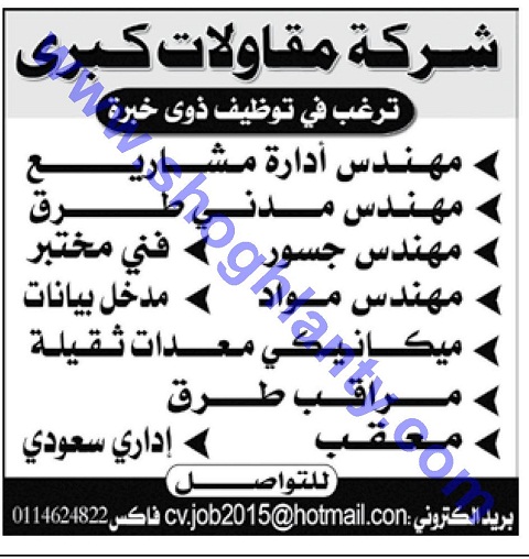 تعلن شركة مقاولات كبري ترغب في توظيف مهندسين وذلك في التخصصات التالية: