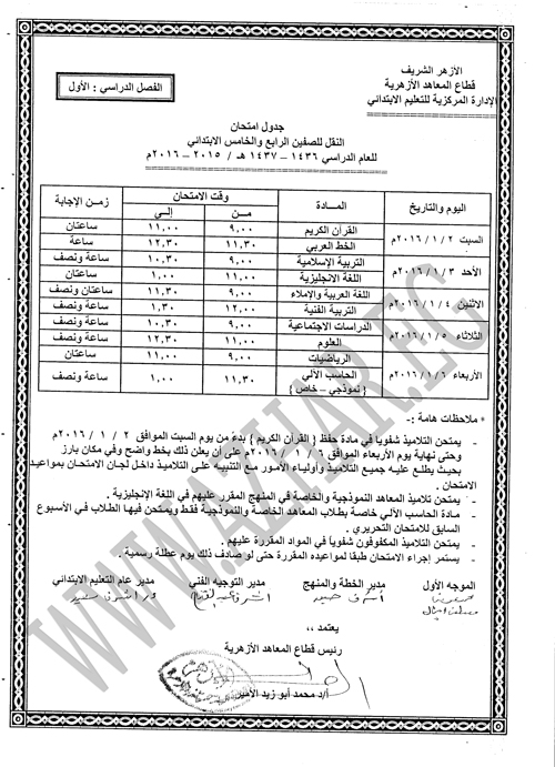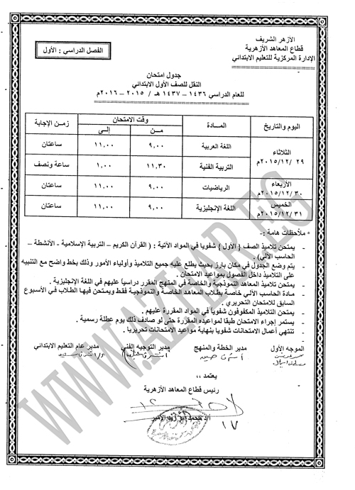 أعلن قطاع المعاهد الأزهرية اليوم الأحد، جدول امتحانات النقل الابتدائى للفصل الدراسى الأول 2016/2015.