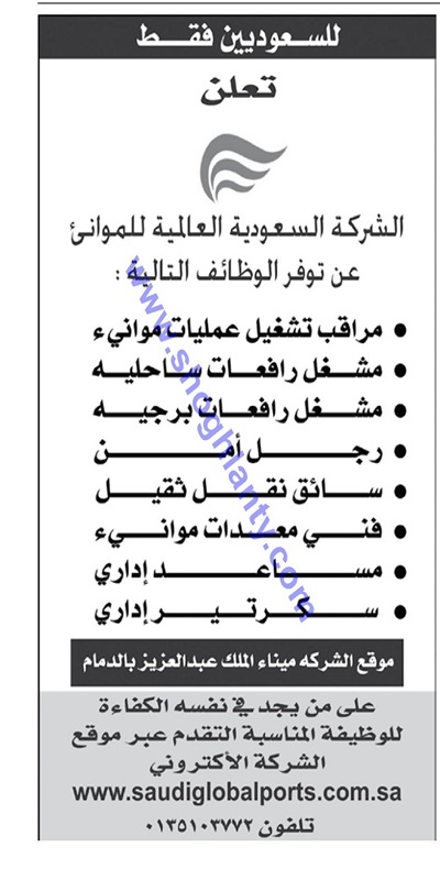 تعلن الشركة السعودية العالمية للموانئ بالمملكة العربية السعودية عن حاجتها للعديد من الوظائف التالية: مراقب تشغيل عمليات موانئ، مشغل رافعات ساحلية، مشغل رافعات برجيه، رجل أمن، سائق ثفقيل، فنى معدان موانئ، مساعد إدارى، سكرتير إدارى، وعلى الراغبين فى التقدم من خلال الموقع الالكترونى: www.saudiglobalports.com.sa