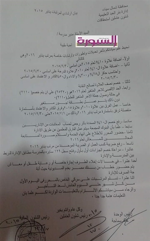 ننشر بيان بكيفية عمل مرتبات يناير والعلاوات والحد الأقصى للأجور للسادة المعلمين بناء على قرار من وزارة التربية والتعليم.